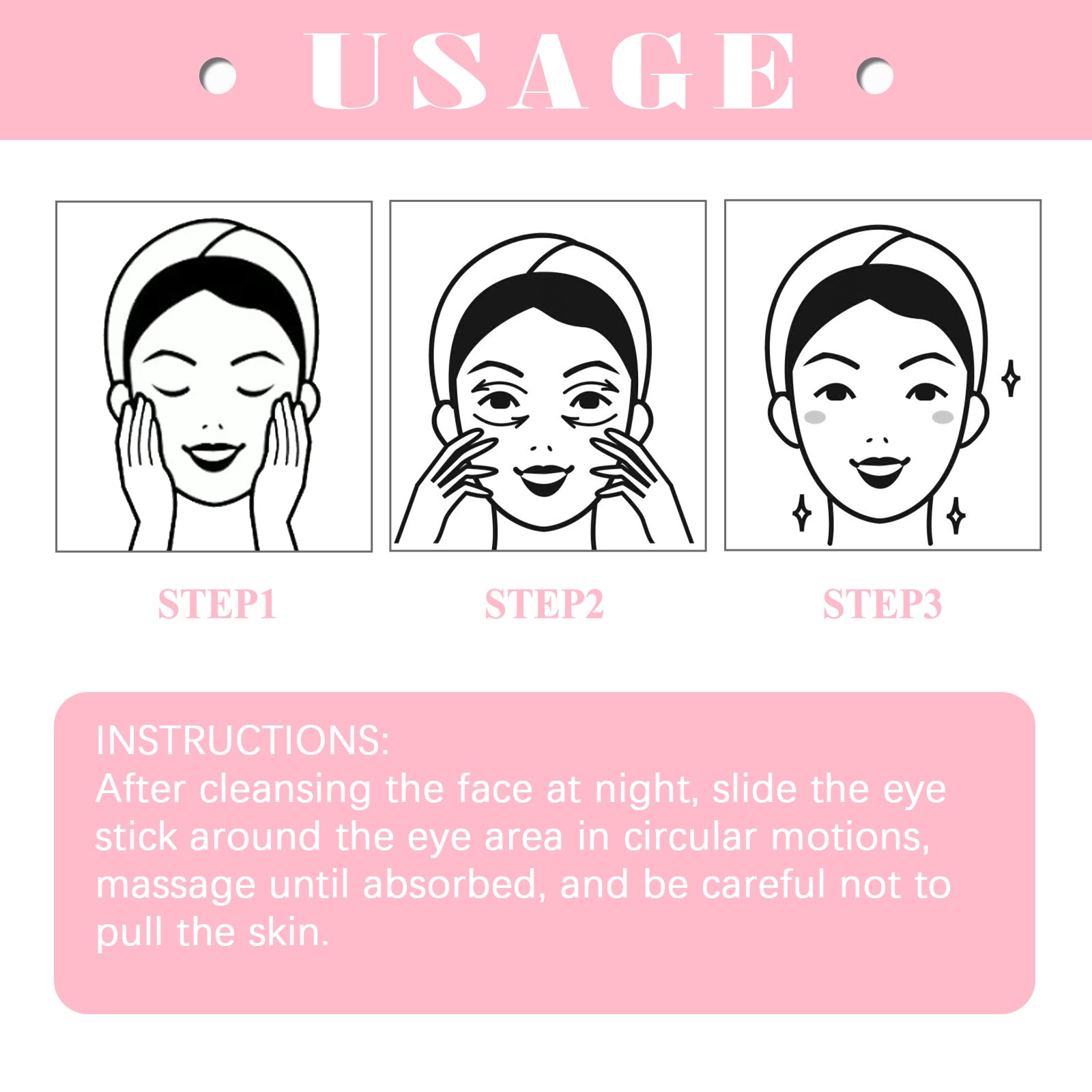 Our retinol eye cream sticks contain mineral oil and glycerin stearate. It can quickly enter the deep layer of the eye, block the formation of canthus fiber, disturb the existing canthus fiber group, and gradually open the skin around the eye. The way to use it is very simple: after cleansing at night, use the eye stick to slide around the eyes in circles and massage until absorbed, taking care not to pull the skin. After use, it helps to lighten fine lines, tighten eyes, remove dark circles, relieve edema, moisturize and make your eyes more beautiful.