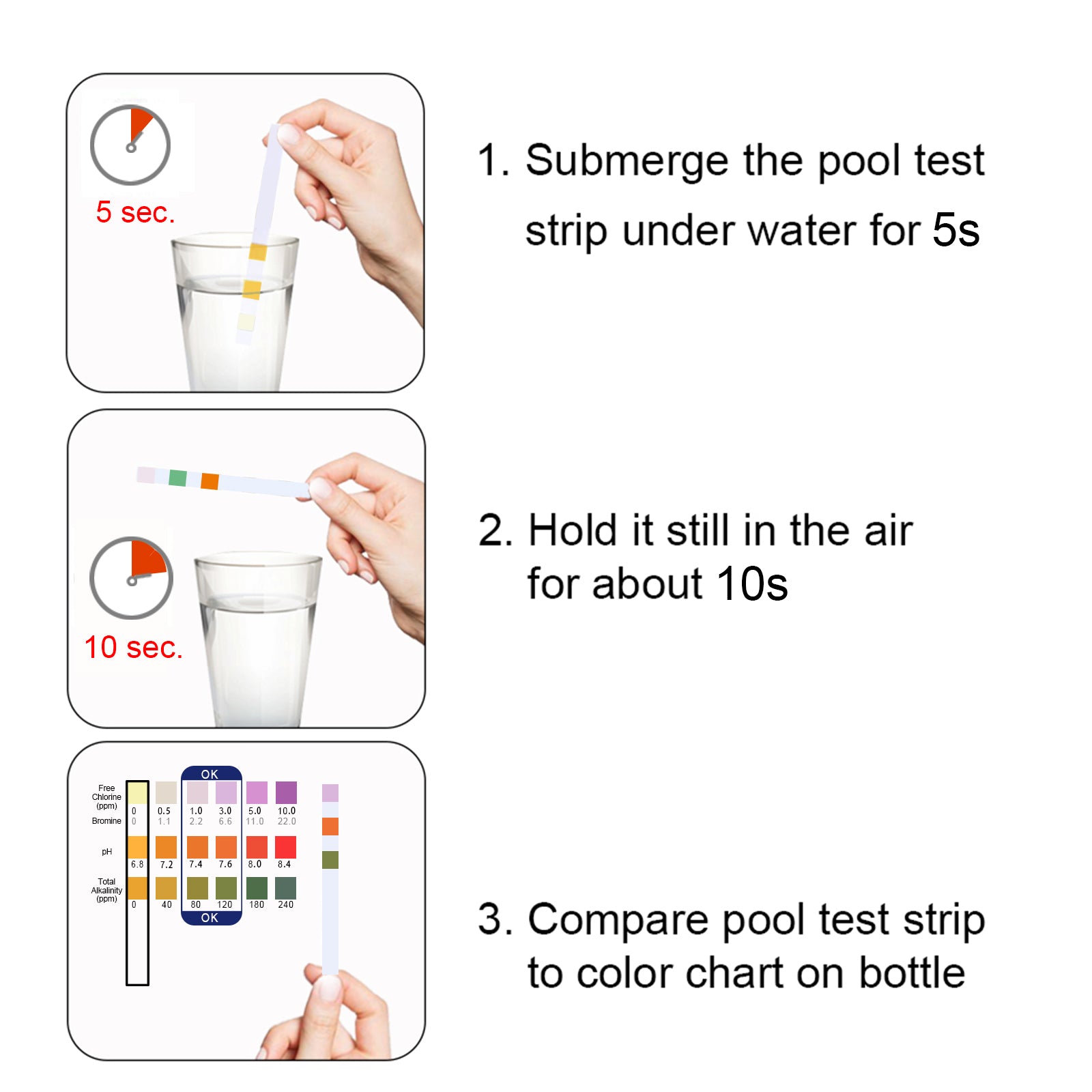 Our Test Strips contains paper. It can quickly detect the approximate range of free chlorine, bromine, ph and total alkalinity in water. Its application method is very simple: Submerge the pool test strip under water for 5s. Hold it still in the air for about 10s. Compare pool test strip to color chart on bottle. Test the water quality so that you and your family can swim more at ease.