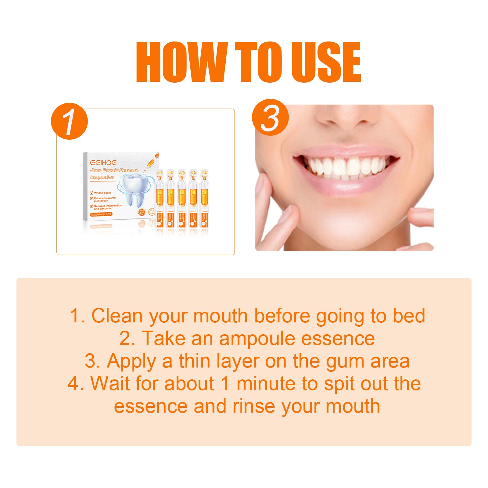 Our teeth repair serum contains water, vitamin C, hyaluronic acid and more. It helps promote natural gum tissue regeneration, strengthens adhesive attachment, reduces inflammation and discomfort, improves overall gum health, and restores a youthful smile. How to use it is simple: 1. Clean your mouth before going to bed. 2. Take an Anbe serum. 3. Apply a thin layer to your gums. 4. Wait about 1 minute before exhaling the essence and gargling. During the initial use, the gums recede and the roots are exposed, during the use, the gums begin to heal, and after the use, the gums heal completely.