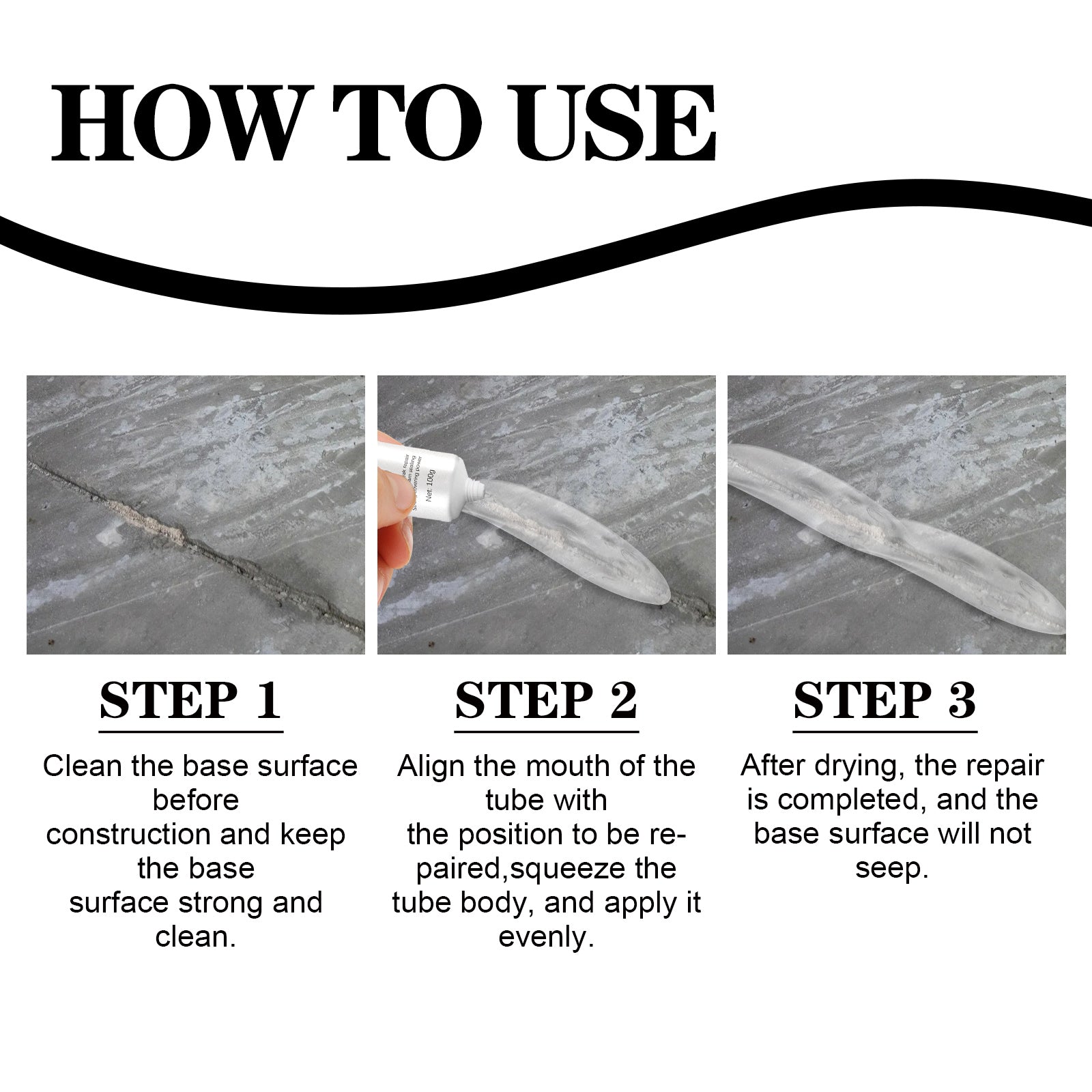 Our waterproof leak repair paste contains polymer copolymers. It can repair the wall, waterproof firmly, prevent leaks, let the wall restore as new. Its use method is very simple: the surface should be cleaned before use, keep the surface firmly clean, and then align the pipe mouth to the position to be repaired, squeeze the pipe body, and evenly apply. After drying, the repair is complete. After use, the surface will not seep water again, economic and durable, strong water resistance, so that the wall is completely repaired.
