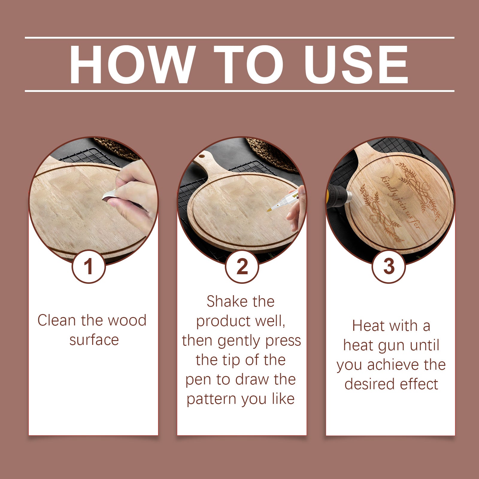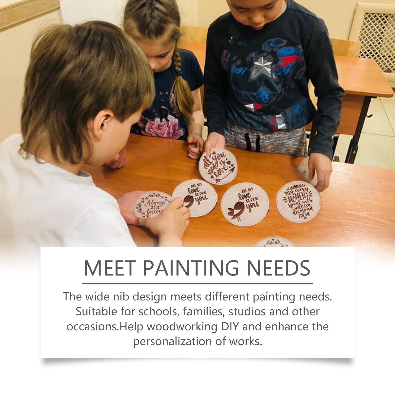 Our woodworking pens contain PET. It can meet different painting needs. Suitable for school, home, studio and other occasions. Help carpentry DIY, enhance the personalization of the work. Its method of use is very simple: clean the surface of the wood, shake the product well and gently press the tip of the pen, draw your favorite pattern, and heat it with a heating gun until the desired effect is achieved. And it can stimulate creativity and make woodworking more fun.